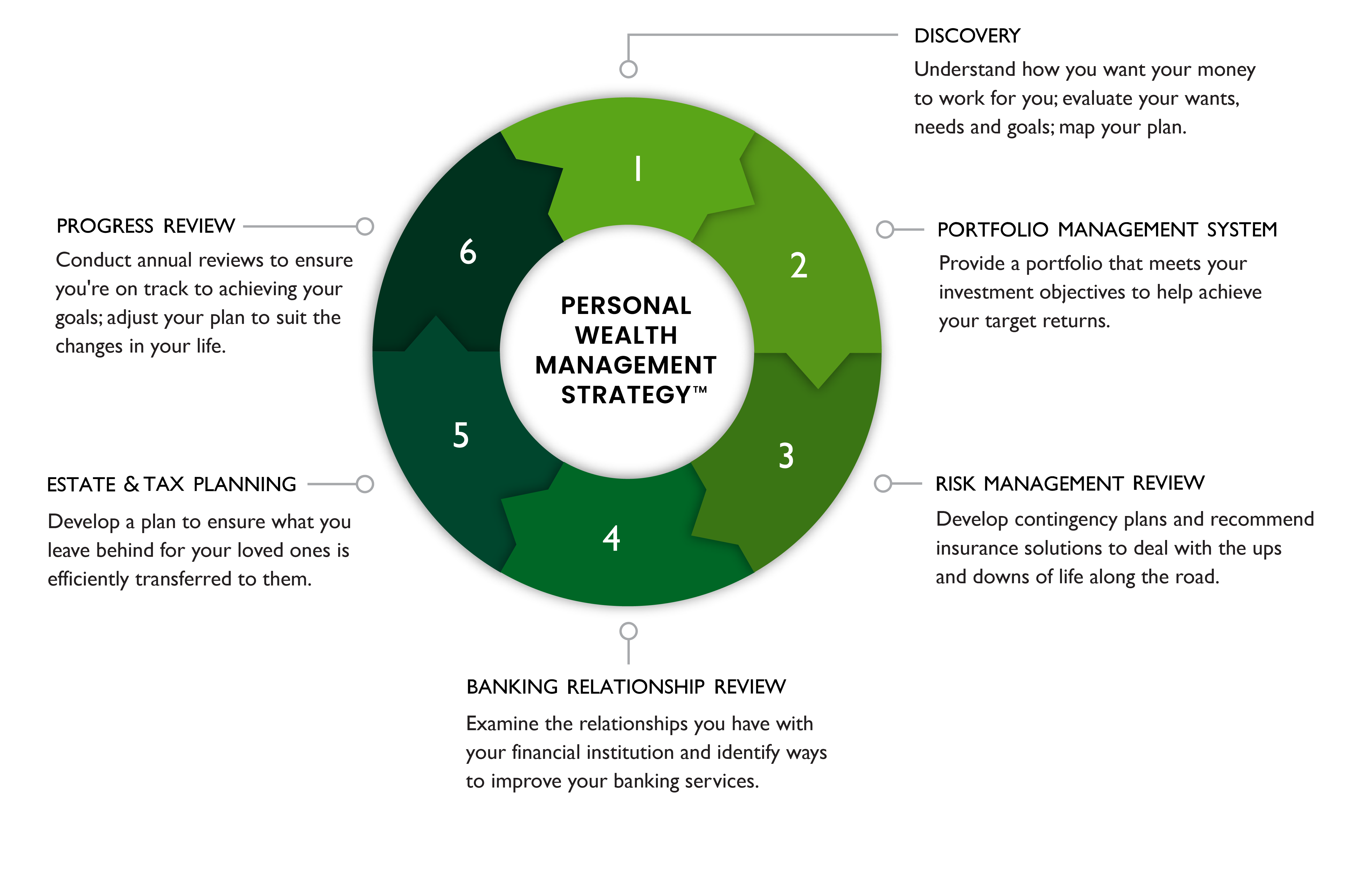 Our team adopts a disciplined process using The Personal Wealth Management StrategyTM. This system allows us to examine all aspects of your financial well-being – from evaluating your current state to understanding your dreams and aspirations – to build the plan that's right for you.